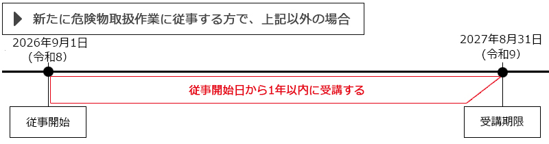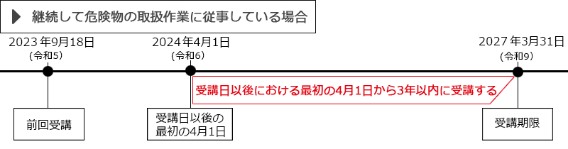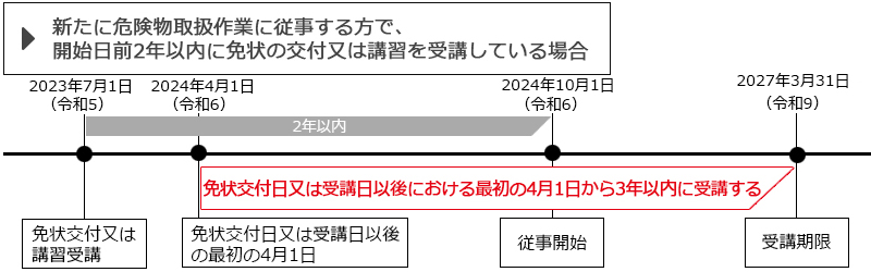 ①従事開始日前2年以内に免状の交付又は講習を受講している場合 免状交付日又は受講日以後における最初の4月1日から3年以内に受講する。